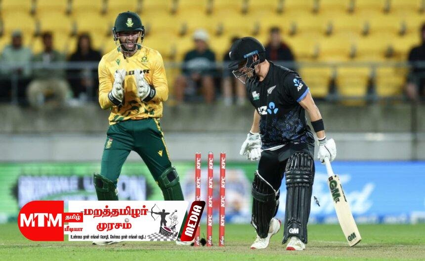 தென் ஆப்பிரிக்கா, நியூஸிலாந்து அணிகள் மோதிய 4வது டி20 போட்டி ஸ்கை மைதானத்தில் நடந்தது.