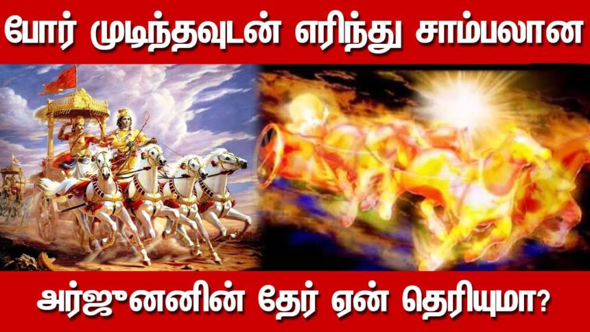 மேலும், கிருஷ்ண பகவான் தேரை விட்டு குதித்த அந்த கணமே தேர் தீப்பற்றி எரிந்து போனது. கிருஷ்ணர் அர்ஜுனனிடம் பார்த்தாயா தேர் எரிகிறது. அதனால்தான் உன்னை கீழே இறங்கச் சொன்னேன் எஎன்றார்.