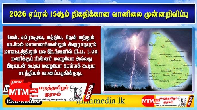 2026 ஏப்ரல் 15ஆம் திகதிக்கான வானிலை முன்னறிவிப்பு 2026 ஏப்ரல் 15ஆம் திகதி அதிகாலை 05.30 மணிக்கு வெளியிடப்பட்டது.