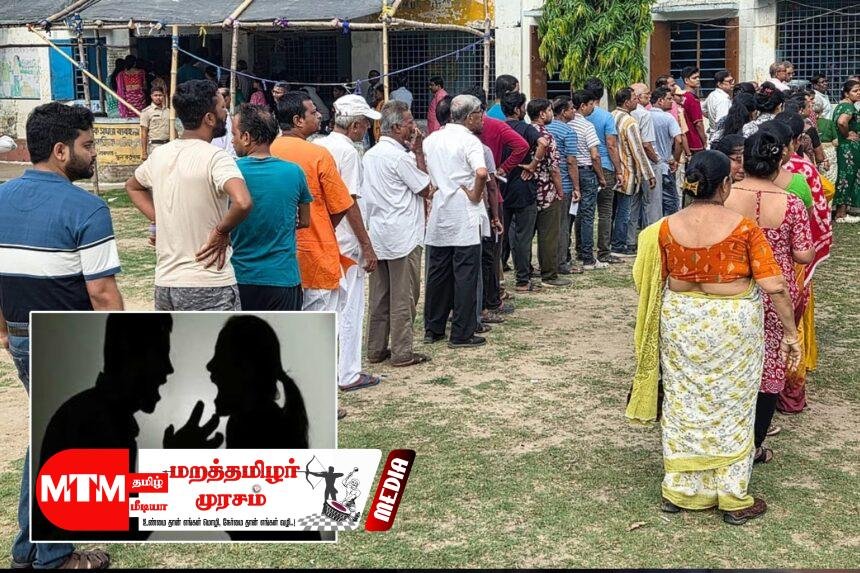 அந்தப் பெண்ணின் வாக்காளர் அடையாள அட்டையில், கணவர் என தனது பெயர் இருப்பதாகக் கூறிய அந்த நபர், தன் பெயரை நீக்காமல் அந்தப் பெண்ணை வாக்களிக்க அனுமதிக்ககூடாது என கூறி வாக்குவாதம் செய்துள்ளார்.