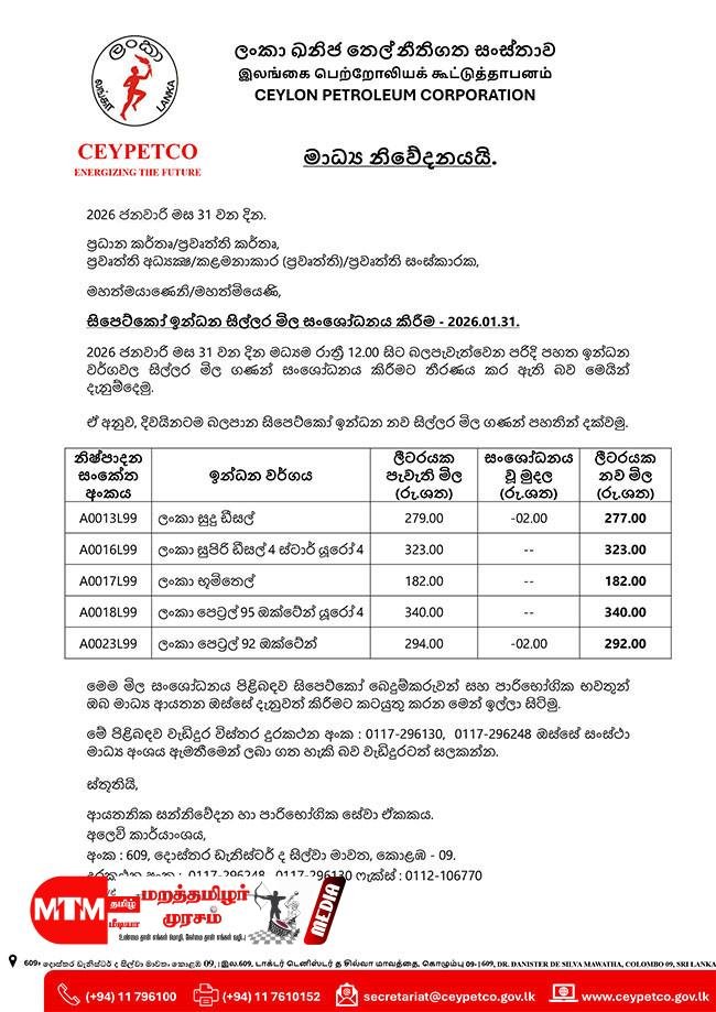 இலங்கையில் மாதாந்திர எரிபொருள் விலை சூத்திரத்தின்படி இன்று நள்ளிரவு முதல்(31/01/2026) புதிய விலை நிர்ணயிக்கப்படுகிறது.
